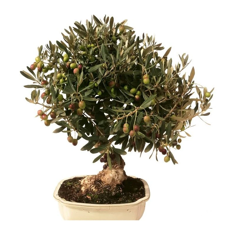 El bonsái olea europaea es un árbol de hoja perenne, de crecimiento lento pero constante. De sus frutos, las aceitunas, se extrae el apreciado aceite de oliva.