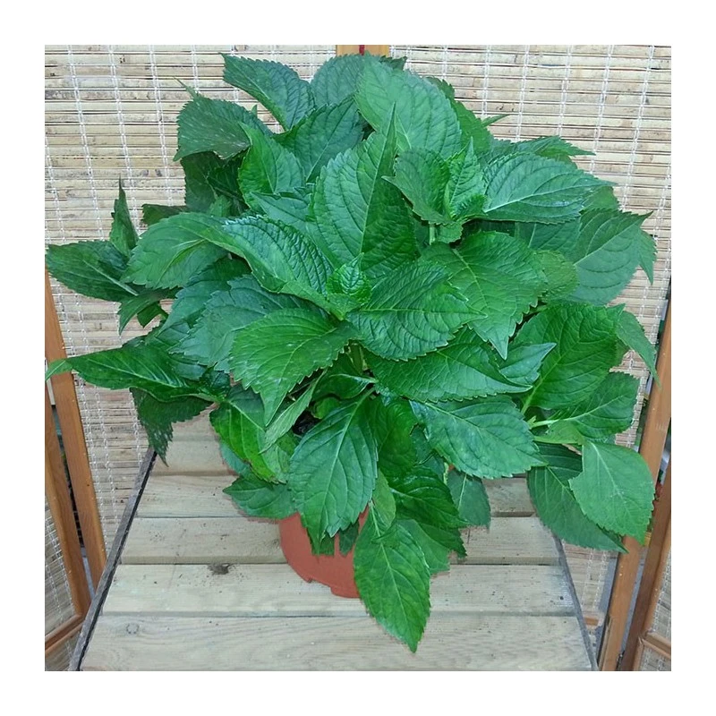 Arbusto caducifolio, las hojas son grandes, verdes, ovaladas con borde dentado terminando en punta.