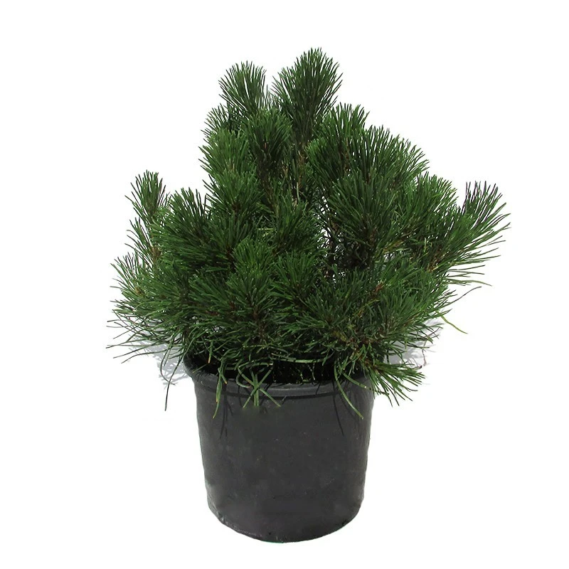 Pino mugo mughus de forma arbustiva y lentro crecimiento y agujas largas de color verde osucuro.