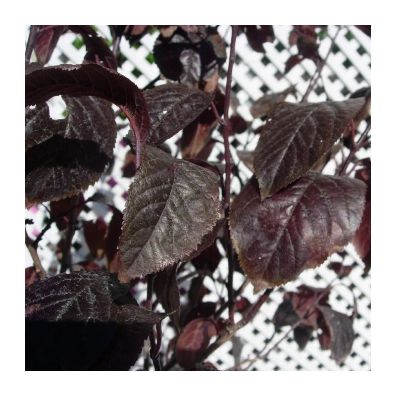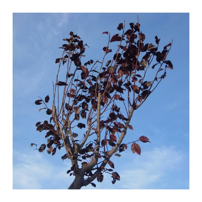 Árbol ornamemtal caducifolio. Hojas caducas, alternas, elípticas, finamente dentadas, lisas de color púrpura.